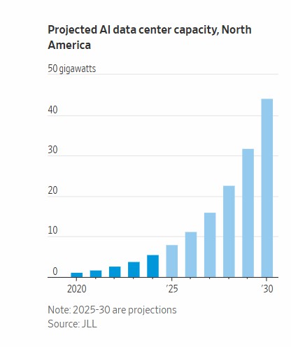 Meta y Microsoft están trabajando para poner en marcha nuevas centrales nucleares. OpenAI y el presidente Donald Trump anunciaron la iniciativa Stargate, cuyo objetivo es invertir 500 000 millones de dólares —más que el programa espacial Apolo— en la construcción de hasta 10 centros de datos (cada uno de los cuales podría requerir cinco gigavatios, más que la demanda total de energía del estado de Nuevo Hampshire). Apple anunció planes para invertir 500 000 millones de dólares en fabricación y centros de datos en EE. UU. durante los próximos cuatro años. Google prevé invertir 75 000 millones de dólares solo en infraestructura de IA en 2025.