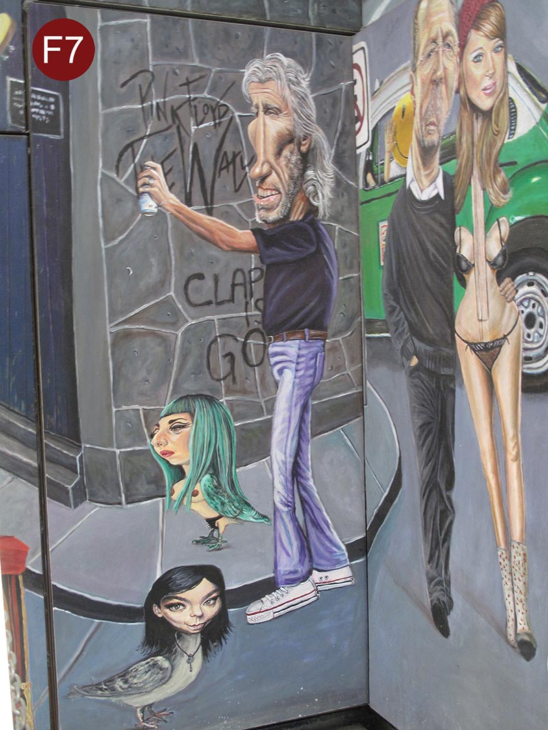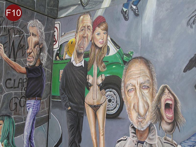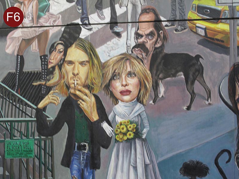 Un cartel de tránsito en inglés indica que se permite un solo sentido de marcha y que además alerta a los conductores de manejar despacio pues es un cruce de “rockanrolleros” (Foto 5). A unos pasos, Kurt Cobain sostiene en su mano a Amy Winehouse y acompaña del brazo a su esposa Cortney Love quien tiene puesto el vestido de satén, con el que se casó (Foto 6). En esa esquina, un músico callejero pide alguna monedita; se trata de Jimi Hendrix que seguramente está interpretando su versión “Star Spangled Banner”. Las llamas que salen de su cabeza servirán para quemar su guitarra más tarde. Toda la escena está siendo supervisada por Elton John desde una ventana. Más a la derecha (Foto 7), en el ángulo que forman los muros, Jorge Flores dibuja a un travieso grafitero que pintarrajea en una pared de la vía pública; el vándalo se llama Roger Waters y está preparando el boceto para la portada de su álbum “The Wall”. A sus pies, caminando por la banqueta, está Lady Gaga vestida con un “look” de pájaro, lista para recibir a sus fans; cubre sus “teclas” con pedacitos de papel confeti. Björk también luce un “utópico” traje de ave para su concierto.