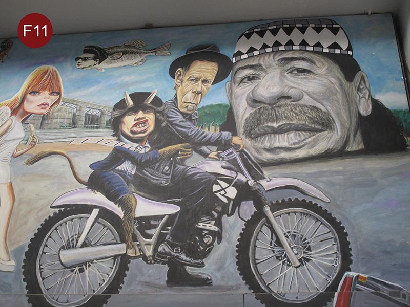 En la parte inferior al extremo izquierdo del muro (Foto 10), Eric Clapton desciende de un taxi abrazando a Layla, canción inspirada en el amor por Pattie Boyd no correspondido hasta ese momento; la rubia tiene cuerpo de guitarra eléctrica. En el centro del muro está Tom Waits montado en su moto teniendo como pasajero a Malcolm Young luciendo sus cuernos (Foto 11). Atrás de ellos se encuentra una cabeza Olmeca representando al mítico Carlos Santana y por allá en el cielo, Roy Orbison vuela en forma de pez, sólo, el solitario.