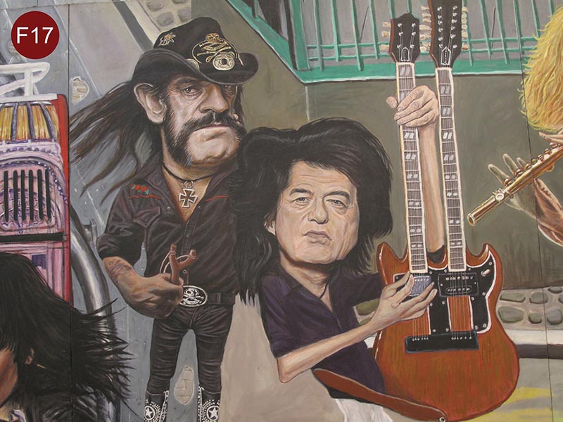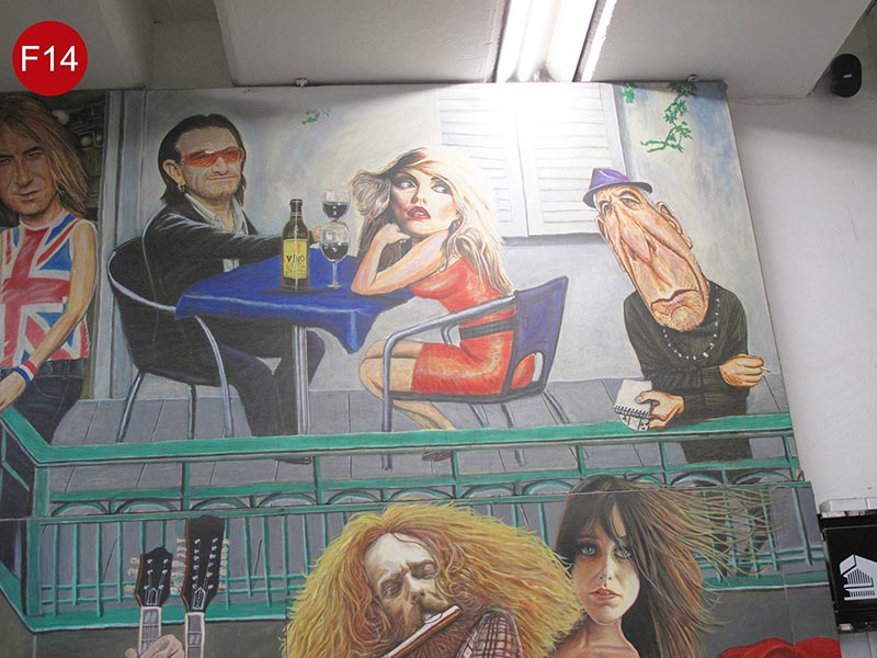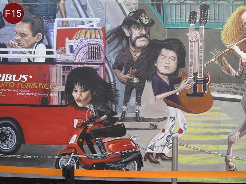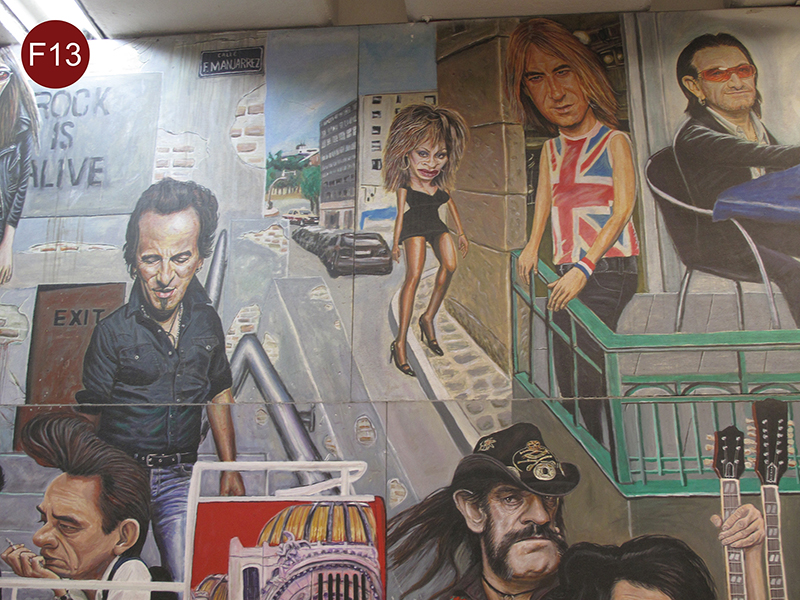 Por una calle estrecha que casualmente se llama “F. Manjarrez”, como el autor del mural, se aproxima caminando por la banqueta “the Queen of Rock ‘n’ Roll”, Tina Turner (Foto 13). De un balcón sobresale Joe Elliot patriotamente visitiendo una camiseta decorada con la bandera de su país. Bono disfruta de un vino con la líder de Blondie, Debbie Harry que se distrae viendo a Leonard Cohen.