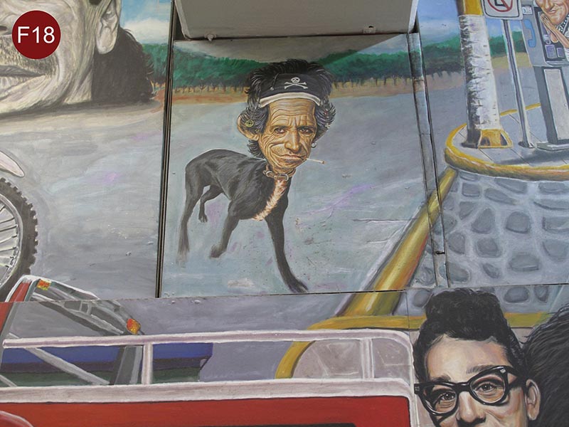 El mural continúa con la imagen de un perro negro corriendo y fumando, es Keith Richards que cubre su frente con un pañuelo de los Piratas del Caribe. Justo atrás de él está Rod Stewart haciendo una llamda telefónica en una cabina de Telmex, vistiendo una camiseta de referee y sus favoritas mallas de leopardo. Al fondo se alcanza a ver el parque de la Alameda y la torre Latinoamericana (Foto12).