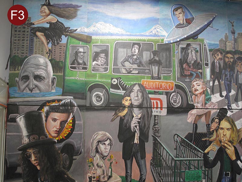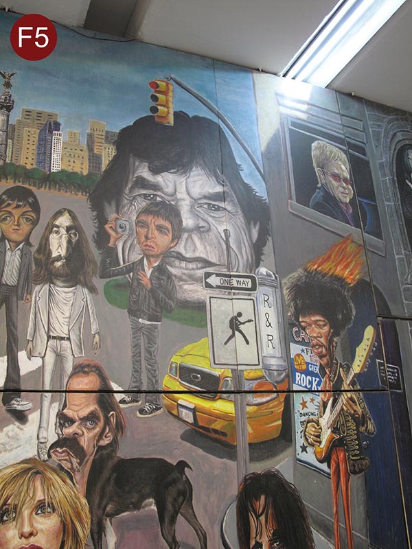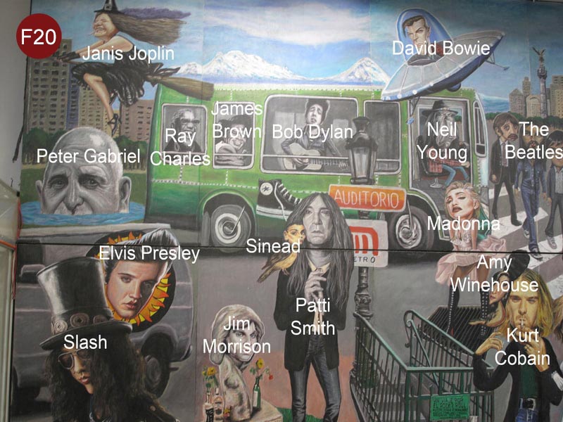 La serie de paneles empieza en el lado izquierdo (Foto 3) con la imagen de Janis Joplin volando, vestida de bruja cósmica, mientras que el cantautor David Bowie vuela dentro el “UFO” en el que presume “haber nacido”. Luego encontramos a Peter Gabriel lavando sus penas en el agua y más abajo se observa la imagen de Elvis Presley en la publicidad de una camioneta de los Estudios “Sun Records” y a Slash con su típico sombrero extravagante. Muy cerca se encuentra la poeta del punk, Patii Smith, teniendo en su hombro a Sinéad O’Connor. Ahí mismo está una estatuilla del grande Jim Morrison rodeada de flores, representando probablemente su tumba en Paris. No podía faltar la grandiosa Madonna que ventila su ropa interior al estilo de Marilyn Monroe con aire producido por el tren subterráneo.