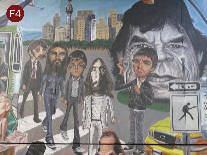 Los Beatles, Foto 3 y 4, pueden cruzar las cebras con toda seguridad gracias a la amabilidad del conductor, Neil Young, chofer de un “pesero” (minibús) que espera pacientemente que los famosos peatones británicos crucen uno a uno en fila india para poder pasar en rojo el semáforo. A bordo del minibús, por unos pesos a cambio, el premio Nobel de Literatura, Bob Dylan, deleita con su guitarra y su armónica a los pasajeros Ray Charles y James Brown que regresan a casa exhaustos de sus respectivas largas jornadas de trabajo. Noel Gallagher inmortaliza con fotos el caminar de su admirado cuarteto de Liverpool. Más atrás, muy cerca del ángel de la independencia, está la cabeza colosal de Mike Jagger sobre una glorieta de Avenida Reforma.