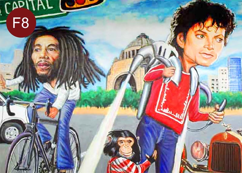 En la segunda parte del mural, nuestro gran caricaturista rinde homenaje a Bob Marley montado en su bicicleta de carreras. Ahí mismo está también Michael Jackson escapando del escenario impulsado por su “Jet-pack” con su querido amigo Bubbles abrazado a la pierna (Foto 8). A un lado se aproxima un vehículo a gran velocidad conducido por Freddie Mercury y teniendo como copiloto a Lou Reed. El lujoso auto de carreras tiene música en vivo integrada; Sting es el encargado de tocar su contrabajo como solía hacer en sus inicios como jazzista (Foto 9).