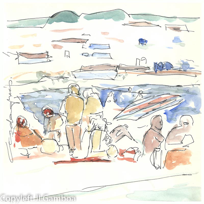 Pasan los camareros mil veces y los que venden collares y los que venden carteras, el feo del limpiabotas, el mendigo viejo, la que tatúa con henna, el que lleva las brasas a las shishas, el limpia feo, el que vende asientos, el que vende carteras, el camarero…