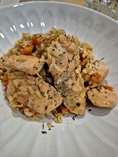 Sabéis que siempre me gusta poneros recetas fáciles, pero creo que esta, se lleva la palma. La verdad es que lo descubrí un día haciendo pruebas en casa con cosas que tenía por la nevera y aunque este, lo he hecho con salmón, también se puede hacer con costilla de cerdo o con tacos de solomillo de cerdo previamente fritos o simplemente con gambas. En cualquier formato, os va a quedar espectacular.