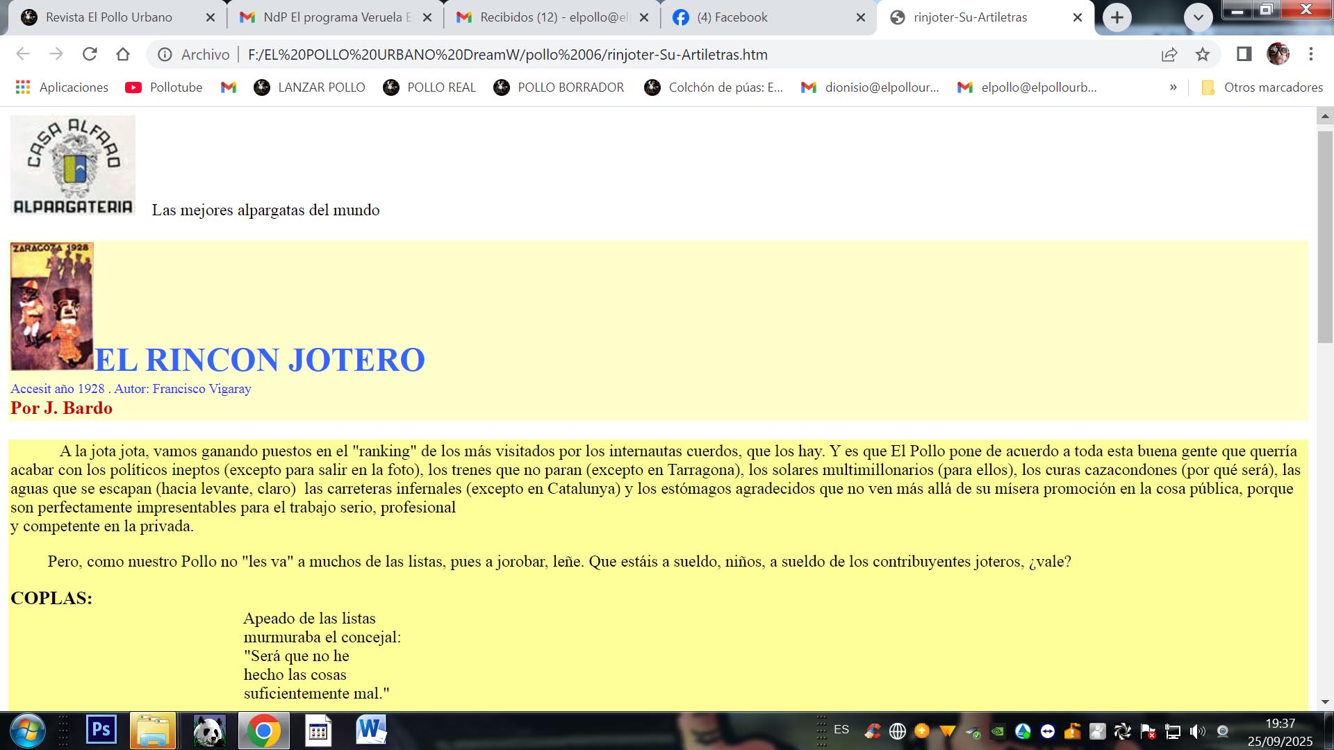 Amigos “polleros” y público en general: sin ánimo de ofender, ni de quitar el pan -y menos el chorizo- a nadie, os presento unas coplas de jota con comentarios que, para el sano regocijo y esparcimiento del buen pueblo aragolés, han sido dadas a luz en “EL POLLO URBANO”, desde su aparición en formato electrónico a través de Internet, en versión cachondo-celtibérico-aragonesa.
