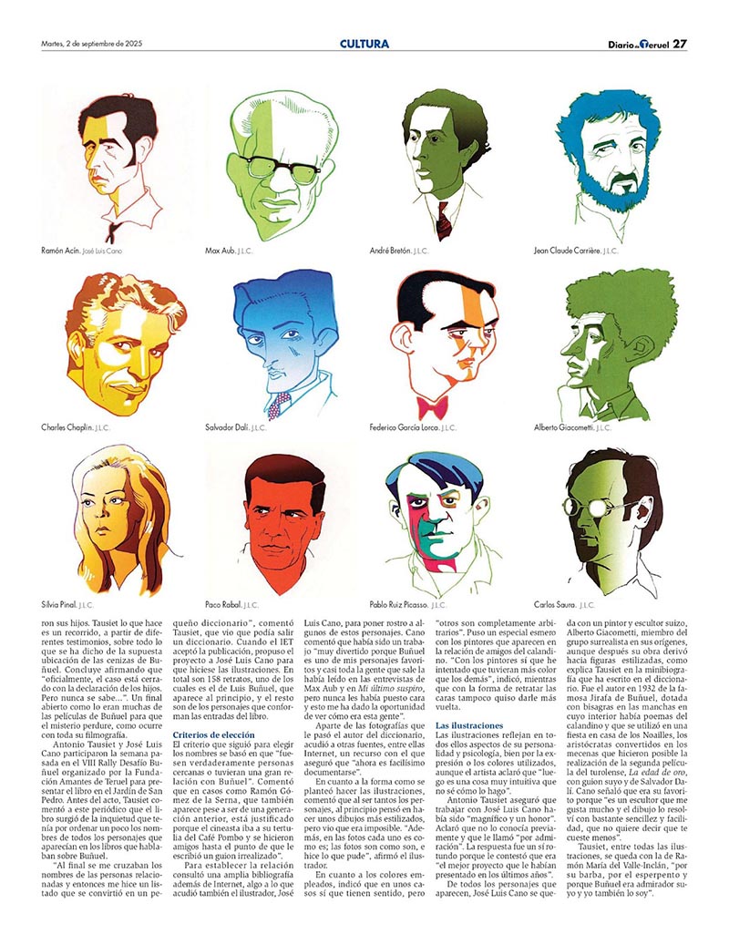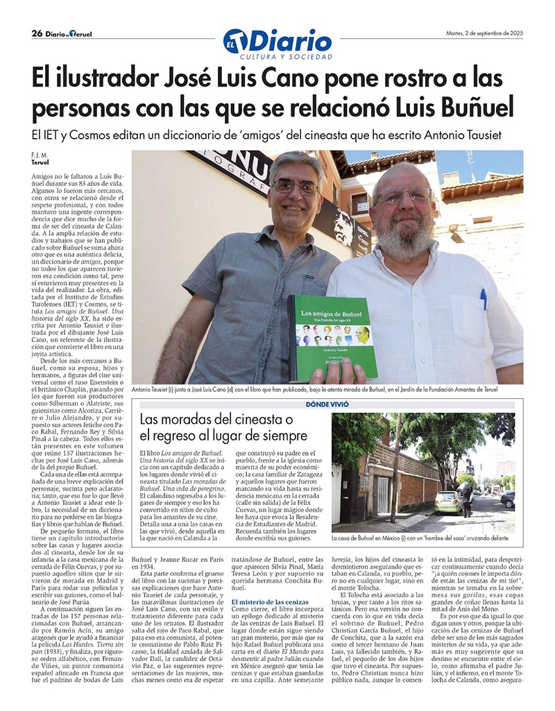 La amistad marcó este viernes la segunda jornada del VIII Rally cinematográfico Desafío Buñuel, que organiza la Fundación Amantes de Teruel […]. De amistad es precisamente de lo que trata un libro presentado este viernes en el festival dentro de su programación, puesto que habla de aquellas personas con las que Luis Buñuel mantuvo una especial amistad. La publicación, titulada Los amigos de Buñuel. Una historia del siglo XX, es obra de Antonio Tausiet y está ilustrada por uno de los grandes de la ilustración aragonesa y española, José Luis Cano.