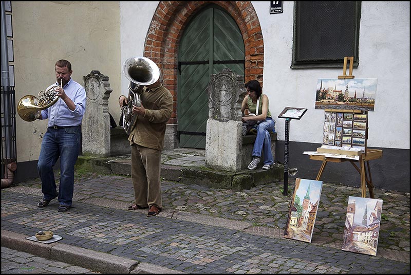 En esta fotografía a los músicos se le ha unido una pintora, también callejera, que vende cuadros e ilustraciones de edificios, de callejones, de rincones y monumentos representativos de la ciudad. Una foto que reúne la música y la pintura ambulante
