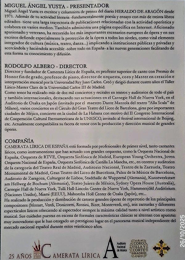 El pasado día 25, en el Auditorio Nacional de Madrid, tuvo lugar una Gala de Ópera celebrando los veinticinco años de Camerata Lírica de España, Compañía de Ópera, que fundó y dirige el tenor zaragozano Rodolfo Albero Colino-Esbec, tercera generación…