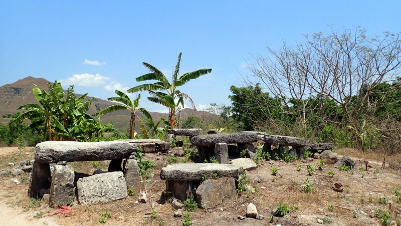 Otra costumbre algo inquietante para nosotros es encontrar tumbas diseminadas por todas partes. Estas tumbas megalíticas pueden concentrarse en algunos terrenos del poblado o simplemente estar situadas en la parcela familiar. Es evidente que la muerte forma parte de su cultura y de su vida. En la actualidad la mayoría de las casas tienen una tumba o panteón con diseños más o menos ostentosos y decoraciones variadas: pintadas, con baldosas, cubiertas con techo o con cruces y Jesucristos (en el caso de que la familia sea cristiana).