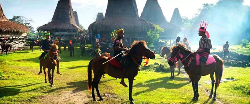 Una de las ceremonias rituales más importantes en Sumba es la “Pasola”. Se trata de un festival con caballos y jinetes (cabalgando sin silla) en el que simulan una batalla y lanzan contra los adversarios lanzas de madera (que en nuestros días tienen la punta metálica sin filo) con la finalidad de hacer correr la sangre sobre la tierra y agradecer una recolección de arroz fructuosa. Hoy en día se presenta como un juego vistoso y espectacular, y el derrame de sangre queda limitado al sacrificio de animales en algunas ocasiones. Este espectáculo es todavía más espléndido gracias a la raza de unos caballos autóctonos de la isla, de hermosa y fuerte figura, de menor tamaño que los árabes.