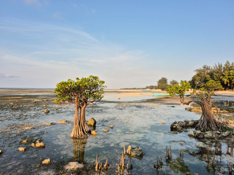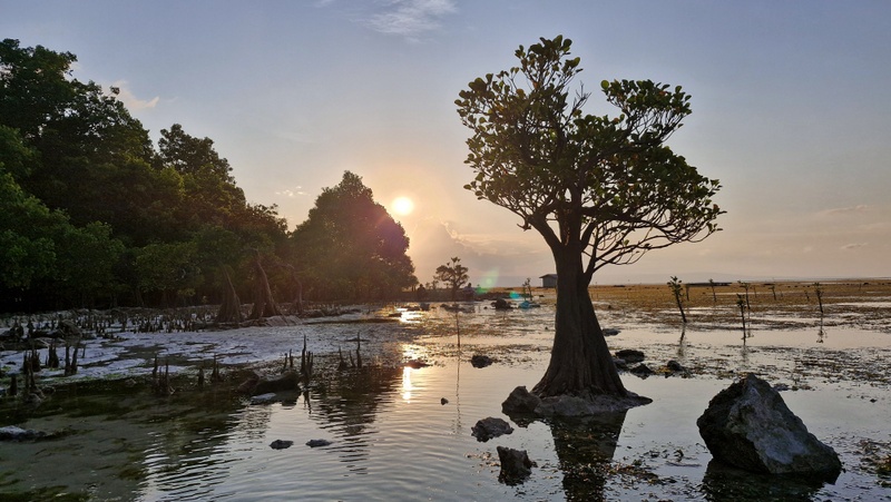 Nosotros recorrimos más la costa y pudimos descubrir playas de arena blanca muy fina con pequeños acantilados. Destacaría en primer lugar la playa Walakiri, cuyo manglar presenta unos árboles que parecen danzar y contornearse al atardecer con marea baja media, pues el reflejo de los árboles y el color del cielo presentan al viajero un espectáculo estremecedor.