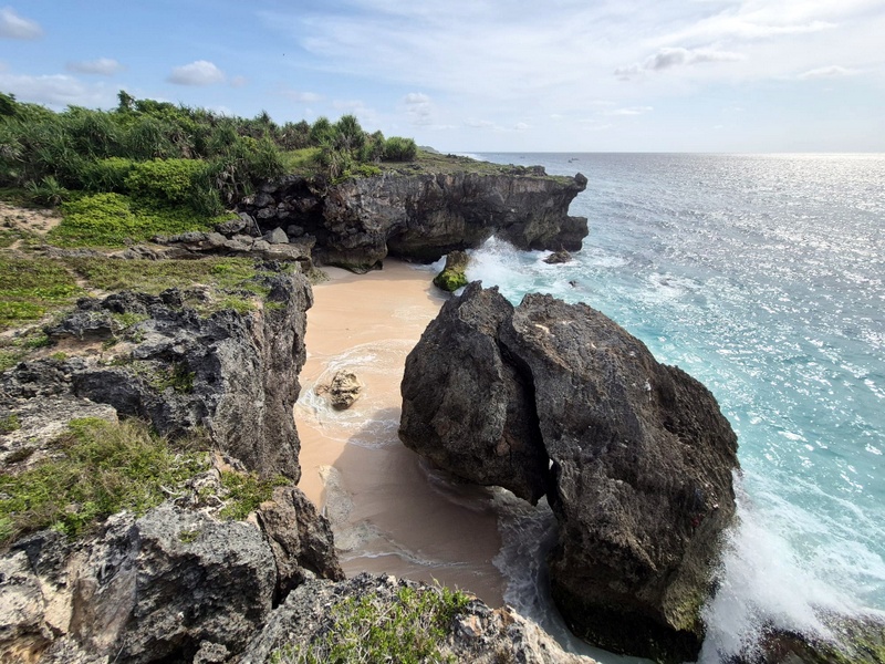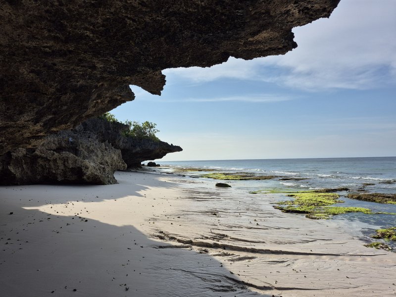 Como despedida visitamos la playa Kawona, preparada para recibir visitantes con bares con terrazas y refrescos, pero donde apenas nos cruzamos con nadie. Esta playa se extiende a la izquierda bajo la erosión de las rocas y proporciona un paseo sombreado con techumbre rocosa muy singular.