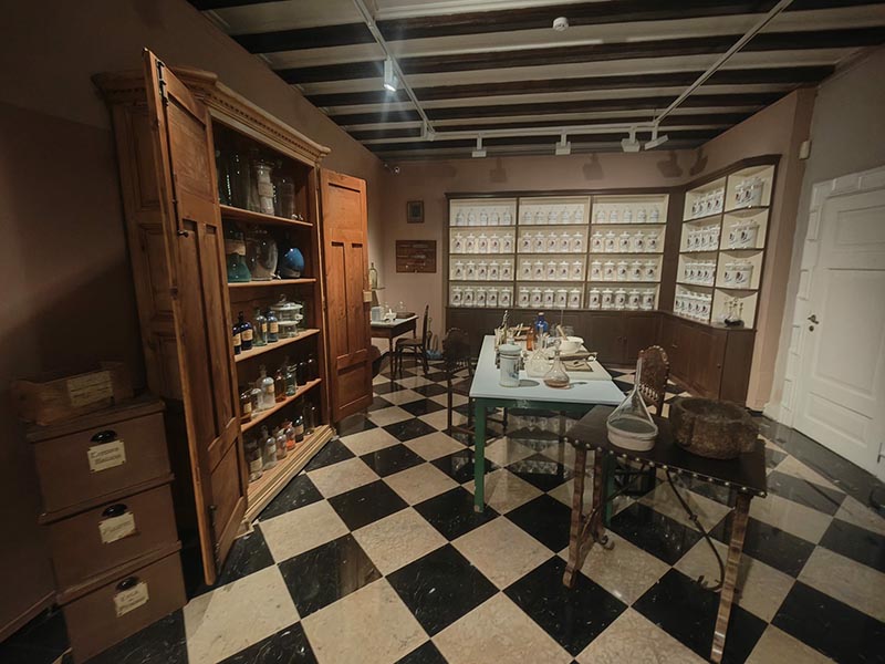 La botica ocupa el ámbito 7 en la exposición. Era el lugar donde se preparaban las medicinas, se guardaban los productos necesarios para su elaboración y se despachaban. Allí se atendían las prescripciones dadas por los médicos y cirujanos en sus visitas a los enfermos. De la farmacia del Hospital de Gracia no se conserva casi nada, salvo albarelos y morteros sueltos en colecciones particulares y parte de la documentación. La farmacia del Hospital Provincial es propiedad de la Diputación de Zaragoza, y se mantiene tal y como se renovó en 1881 con todo su mobiliario, instrumental y botamen originales.